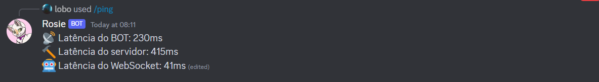 O comando /ping é usado para detetar a latência do bot, servidor e websocket.